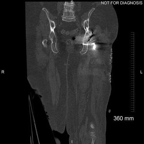 Coronal CT scan taken to plan for the custom acetabular component